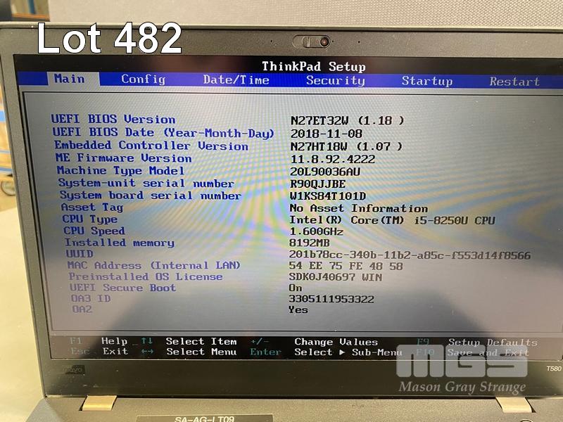 LAPTOP, LENOVO THINKPAD T580, TYPE 20L9, CORE i5 8250U (8TH GEN) @ 1.8GHz, 8GB DDR4 RAM, 256GB NVMe M.2 SSD, 15.6" WIDESCREEN (1920x1080), INTEL UHD GRAPHICS, Wi-Fi, BLUETOOTH, WINDOWS 11 PRO INSTALLED (NO USB-C POWER SUPPLY) (NOTE: MARKS ON SCREEN) S/N:R90QJJBE