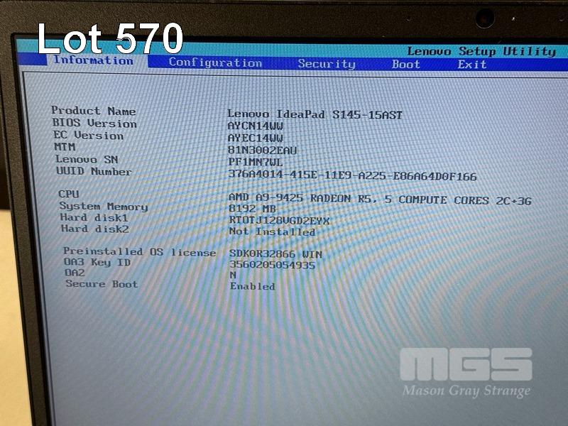 LAPTOP, LENOVO IDEAPAD S145-15AST, AMD A9-9425 @ 3.1GHz, 8GB DDR4 RAM, 128GB SSD, 15.6" WIDESCREEN, (1366x768), Wi-Fi, BLUETOOTH, WINDOWS 10 HOME INSTALLED (NO POWER SUPPLY) (NOTE: DAMAGED CASING, MARKS ON SCREEN) S/N:PF1MN7WL
