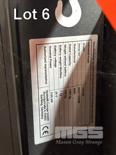 TOYOTA ELECTRIC PALLET JACK, MOD: LEH150, DOM: 2024 , HRS: 42.1, 1500kg CAP, WITH CHARGER 240V 10 AMP