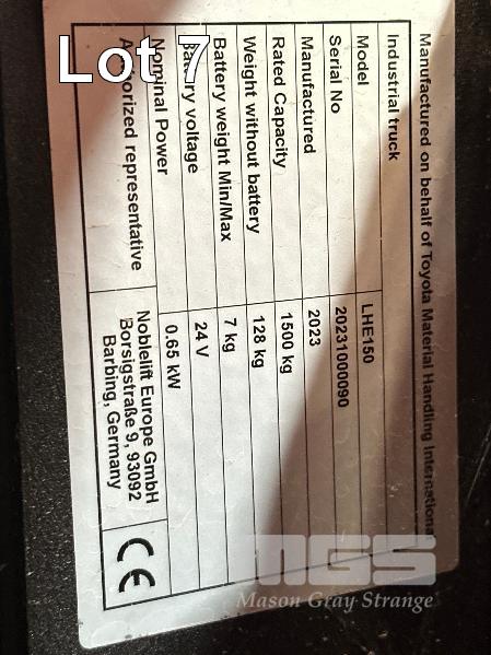 TOYOTA ELECTRIC PALLET JACK, MOD: LEH150, DOM: 2023 , HRS: 158.8, 1500kg CAP, WITH CHARGER 240V 10 AMP