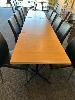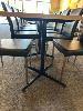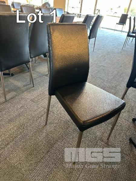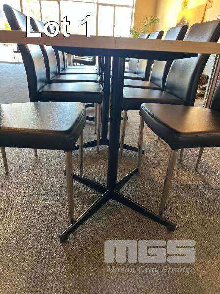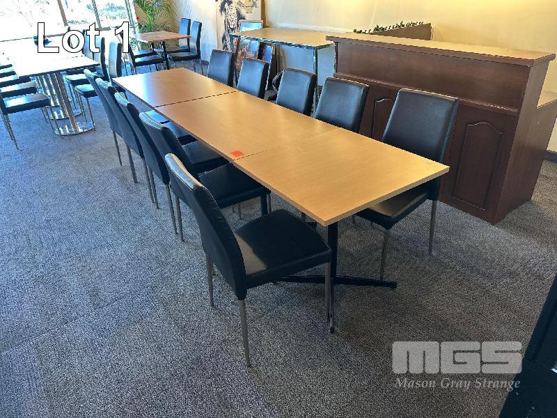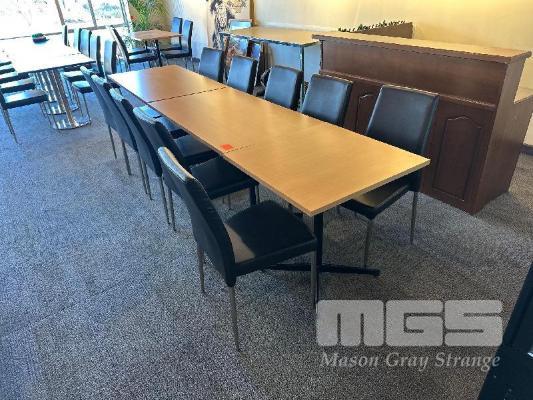 2 x TABLES, BEECH TIMBER LAMINATE TOP, 1200 x 700mm, 1 x TABLE, BEECH TIMBER LAMINATE TOP, 700 x 700mm 10 x HIGH BACK DINING CHAIRS, BLACK VINYL, CHROME LEGS