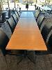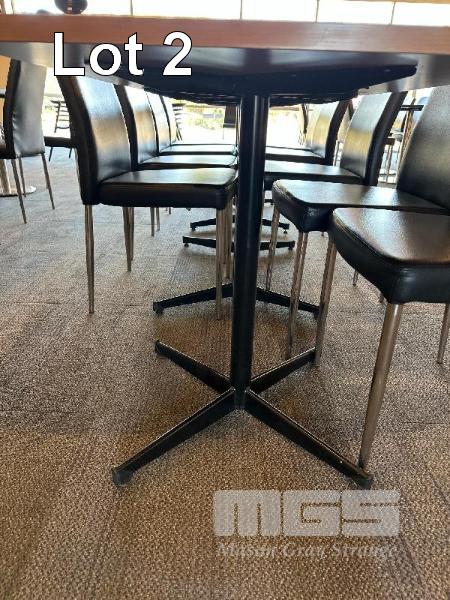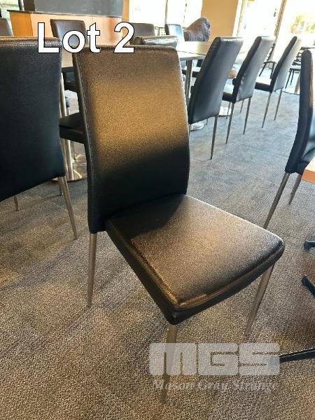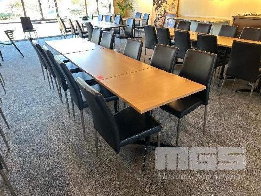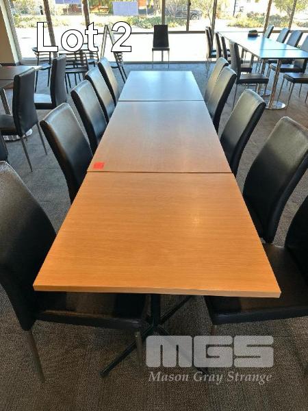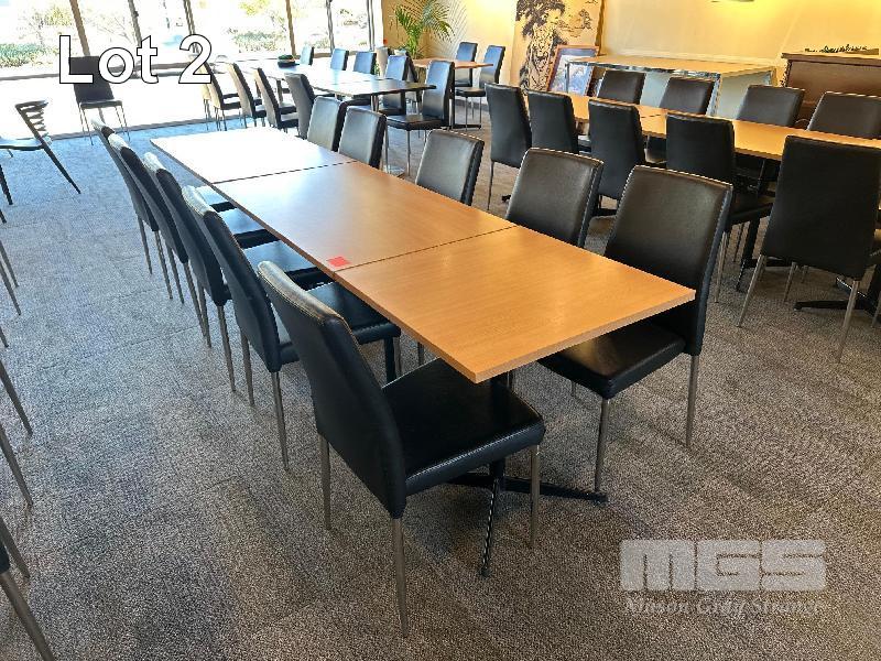 2 x TABLES, BEECH TIMBER LAMINATE TOP, 1200 x 700mm, 1 x TABLE, BEECH TIMBER LAMINATE TOP, 700 x 700mm 10 x HIGH BACK DINING CHAIRS, BLACK VINYL, CHROME LEGS