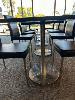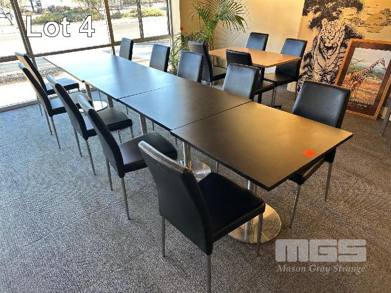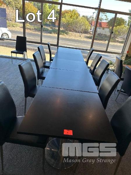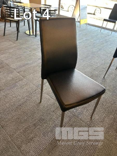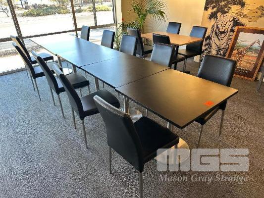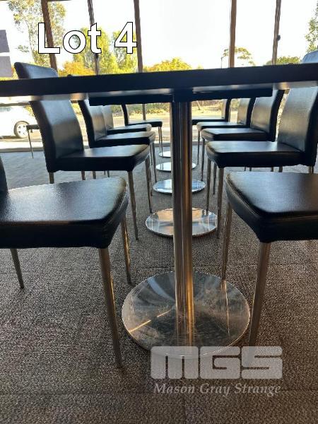 5 x CAFE TABLES, BLACK TIMBER LAMINATE TOP, CHROME PEDESTAL BASE, 800 x 800mm 10 x HIGH BACK DINING CHAIRS, BLACK VINYL, CHROME LEGS