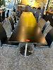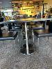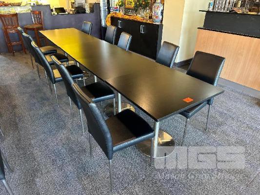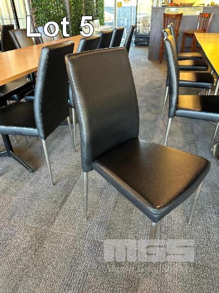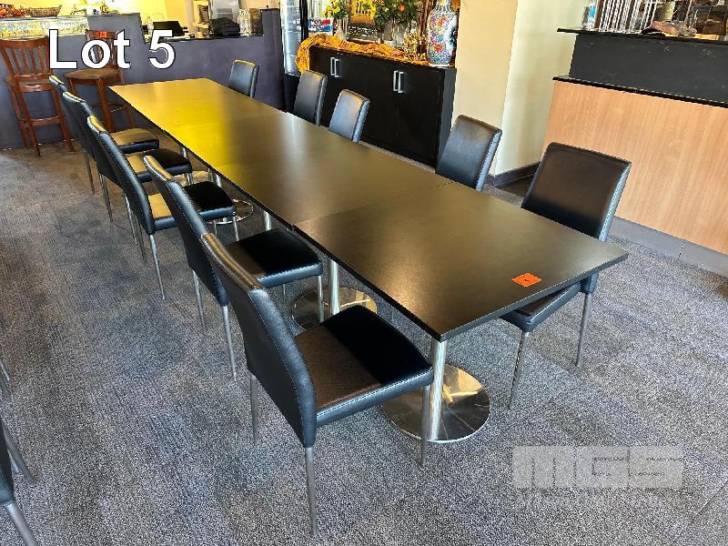 5 x CAFE TABLES, BLACK TIMBER LAMINATE TOP, CHROME PEDESTAL BASE, 800 x 800mm 10 x HIGH BACK DINING CHAIRS, BLACK VINYL, CHROME LEGS