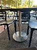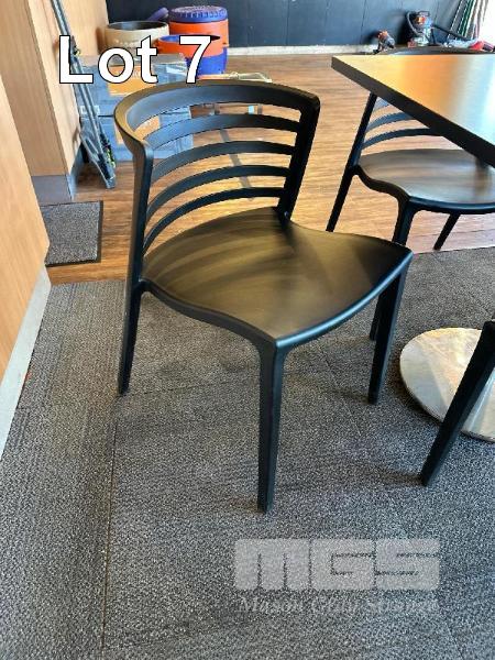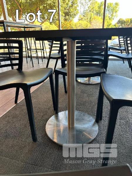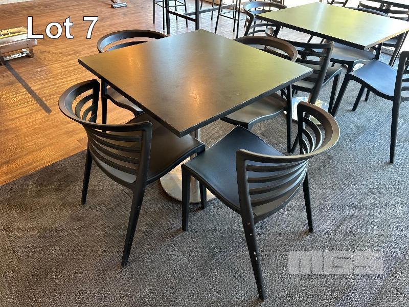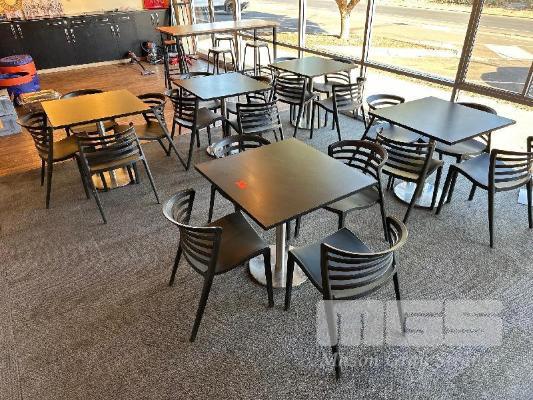 5 x CAFE TABLES, BLACK TIMBER LAMINATE TOPS, 800 x 800mm, CHROME PEDESTAL BASE 22 x BLACK PVC CHAIRS, STACKABLE