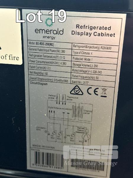 EMERALD SINGLE DOOR UPRIGHT DISPLAY FRIDGE, 4 WAY GLASS, ILLUMINATED, 290L WITH BOOK, 240V