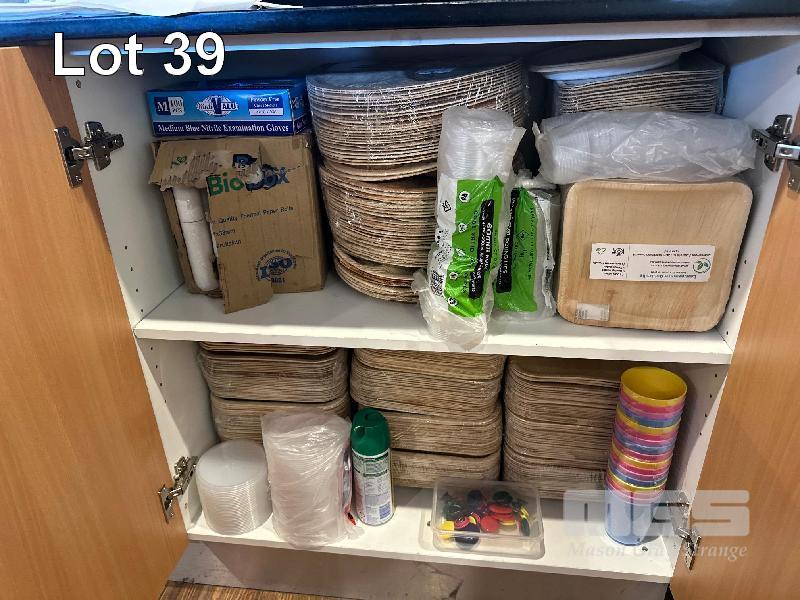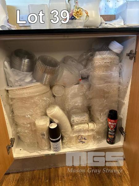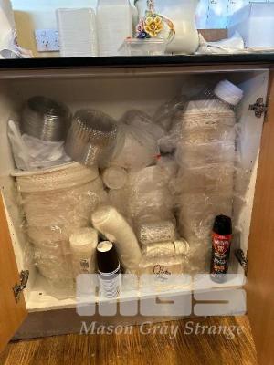 CONTENTS OF 2 x CUPBOARDS, LARGE QUANTITY TAKEAWAY CONTAINERS, CUPS ETC.