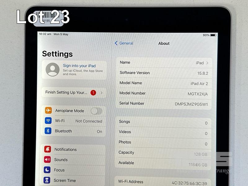 APPLE iPAD AIR 2, 128GB, Wi-Fi, SPACE GREY, MODEL MGTX2X/A, A1566 (NO CABLE, NO CHARGER) S/N:DMPSJMZ9G5W1