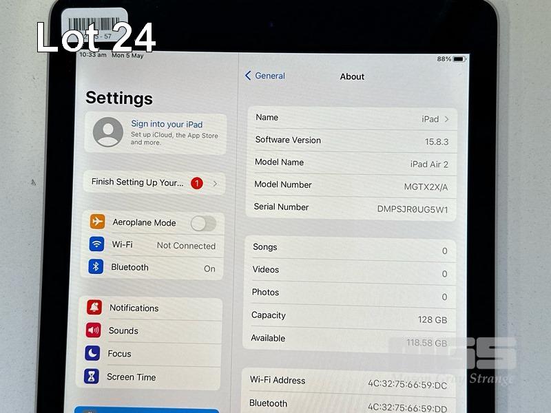 APPLE iPAD AIR 2, 128GB, Wi-Fi, SPACE GREY, MODEL MGTX2X/A, A1566 (NO CABLE, NO CHARGER) S/N:DMPSJR0UG5W1