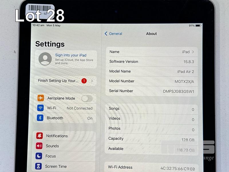 APPLE iPAD AIR 2, 128GB, Wi-Fi, SPACE GREY, MODEL MGTX2X/A, A1566 (NO CABLE, NO CHARGER) S/N:DMPSJGB3G5W1