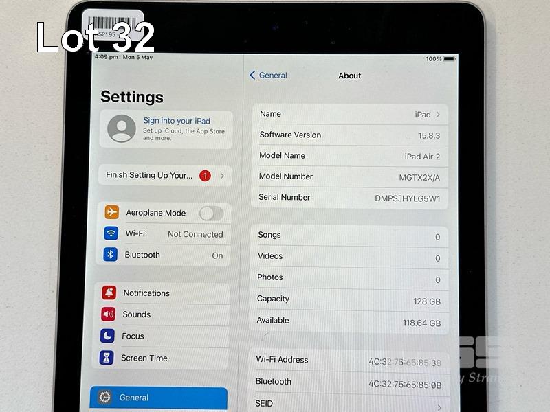 APPLE iPAD AIR 2, 128GB, Wi-Fi, SPACE GREY, MODEL MGTX2X/A, A1566 (NO CABLE, NO CHARGER) S/N:DMPSJHYLG5W1