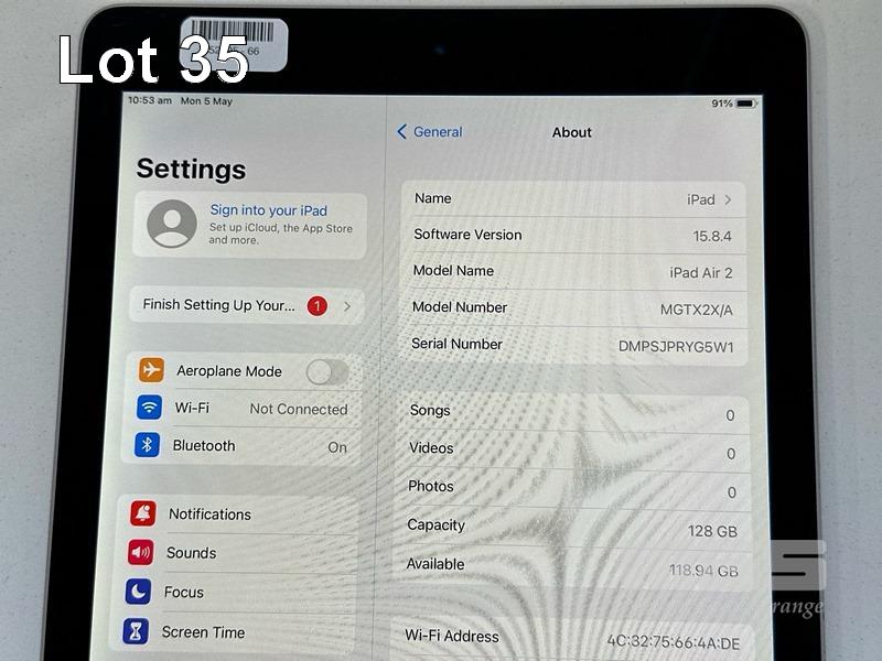 APPLE iPAD AIR 2, 128GB, Wi-Fi, SPACE GREY, MODEL MGTX2X/A, A1566 (NO CABLE, NO CHARGER) (NOTE: MINOR SCRATCHES ON SCREEN) S/N:DMPSJPRYG5W1