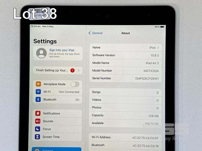 APPLE iPAD AIR 2, 128GB, Wi-Fi, SPACE GREY, MODEL MGTX2X/A, A1566 (NO CABLE, NO CHARGER) (NOTE: CRACK LINE ON SCREEN) S/N:DMPSJKJ7G5W1