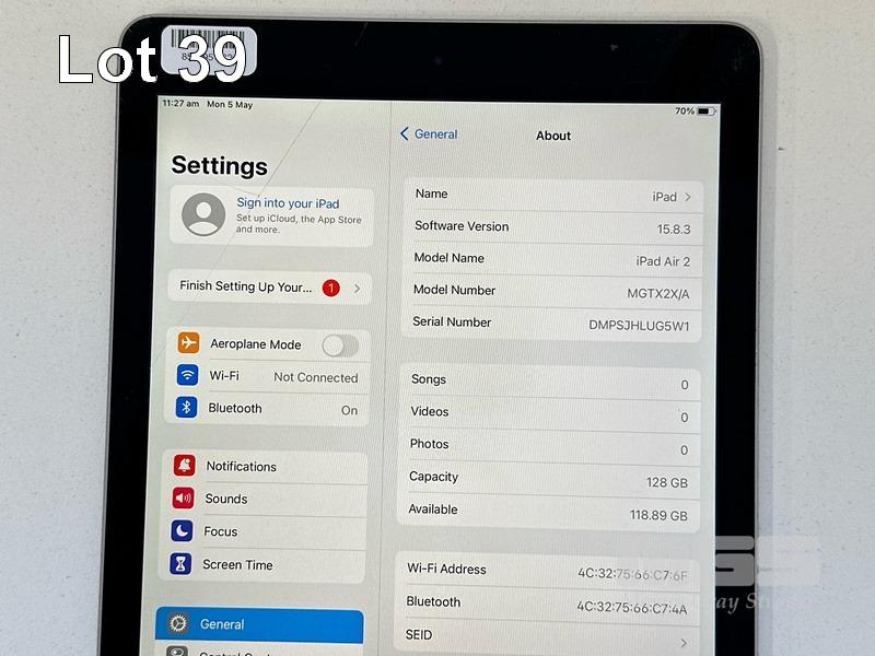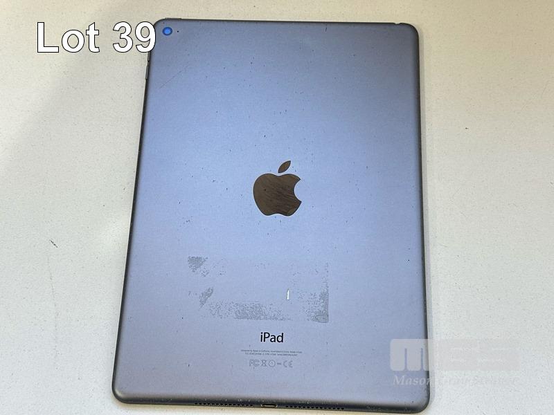 APPLE iPAD AIR 2, 128GB, Wi-Fi, SPACE GREY, MODEL MGTX2X/A, A1566 (NO CABLE, NO CHARGER) (NOTE: DAMAGED SCREEN) S/N:DMPSJHLUG5W1