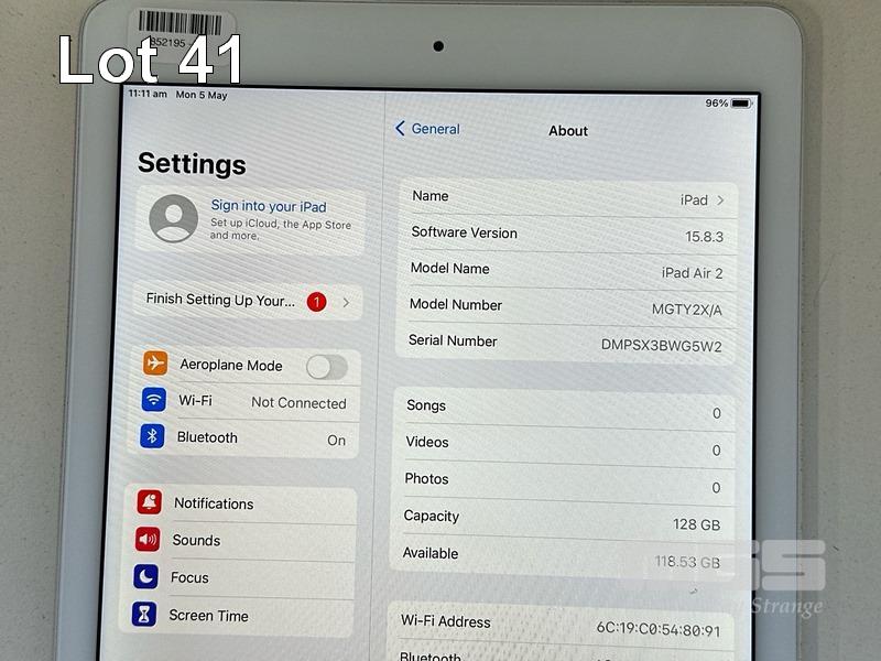 APPLE iPAD AIR 2, 128GB, Wi-Fi, SILVER, MODEL MGTY2X/A, A1566 (NO CABLE, NO CHARGER) (NOTE: MINOR SCRATCHES ON SCREEN) S/N:DMPSX3BWG5W2