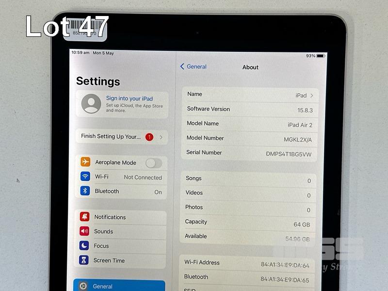 APPLE iPAD AIR 2, 64GB, Wi-Fi, SPACE GREY, MODEL MGKL2X/A, A1566 (NO CABLE, NO CHARGER) S/N:DMPS4T1BG5VW