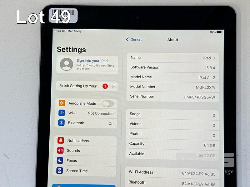 APPLE iPAD AIR 2, 64GB, Wi-Fi, SPACE GREY, MODEL MGKL2X/A, A1566