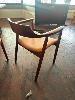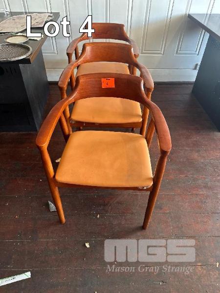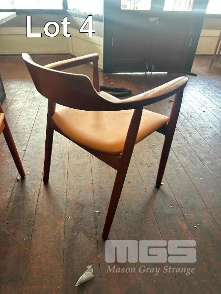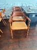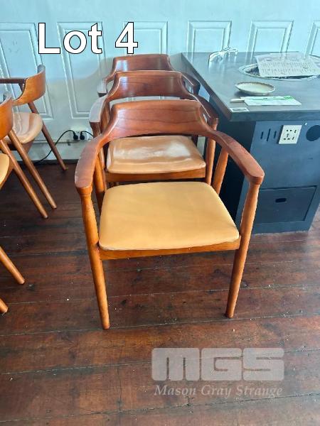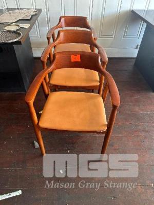 6 x SOLID TIMBER DINING CHAIRS, CURVED TIMBER, TERRACOTTA VINYL SEATS