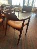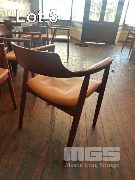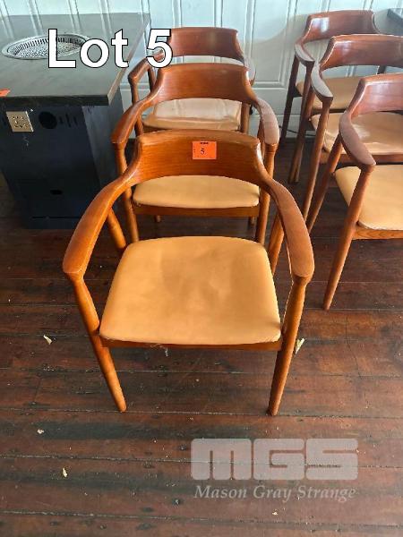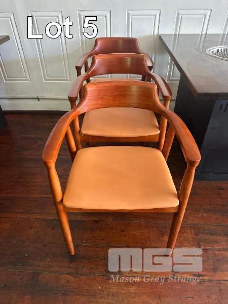 6 x SOLID TIMBER DINING CHAIRS, CURVED TIMBER, TERRACOTTA VINYL SEATS
