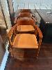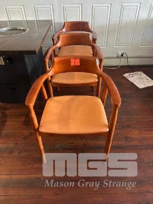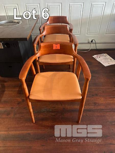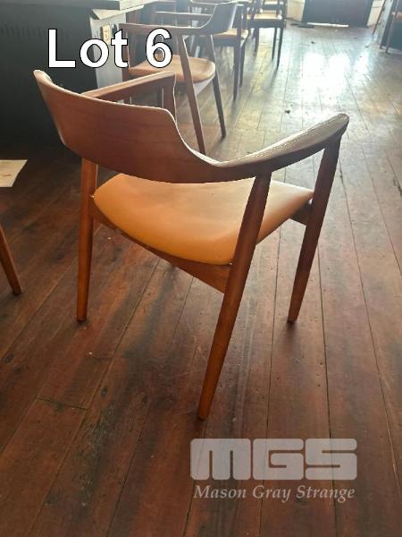 6 x SOLID TIMBER DINING CHAIRS, CURVED TIMBER, TERRACOTTA VINYL SEATS