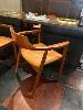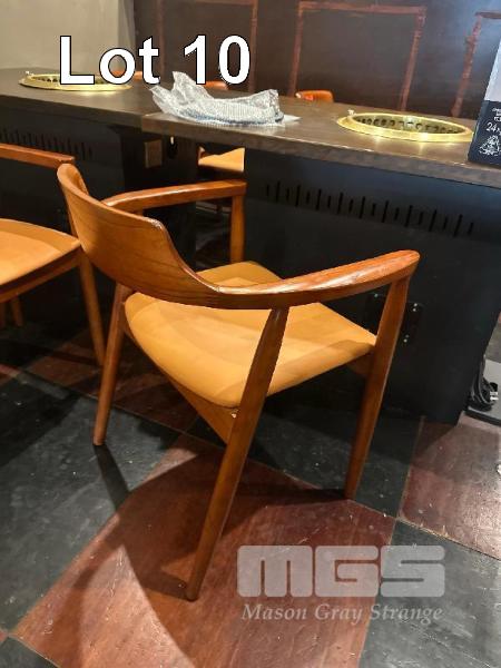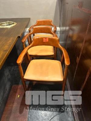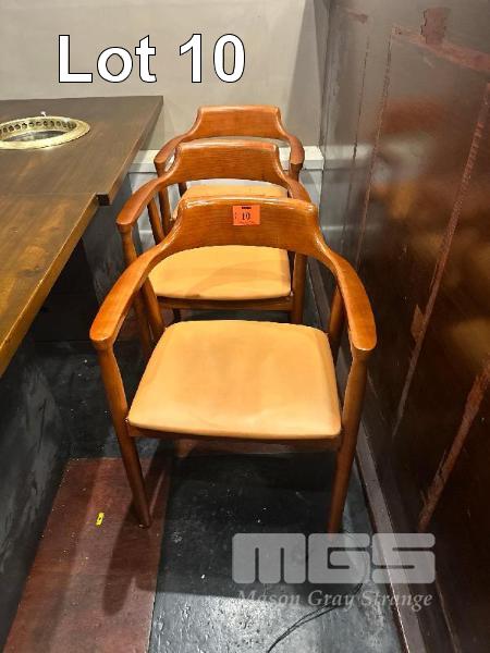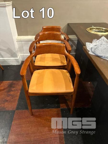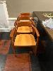 6 x SOLID TIMBER DINING CHAIRS, CURVED TIMBER, TERRACOTTA VINYL SEATS