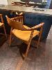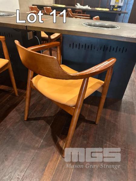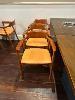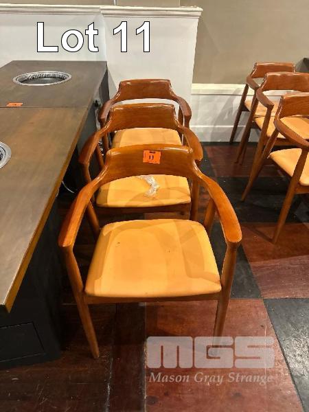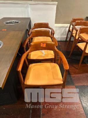 6 x SOLID TIMBER DINING CHAIRS, CURVED TIMBER, TERRACOTTA VINYL SEATS