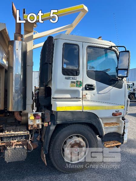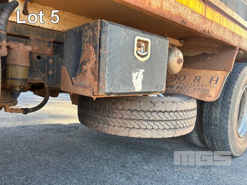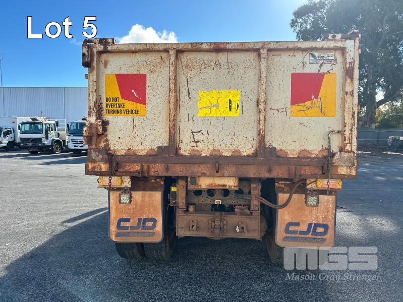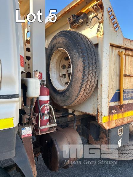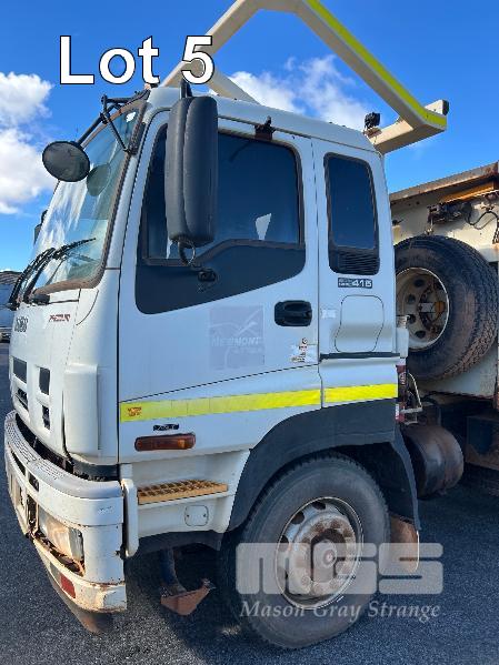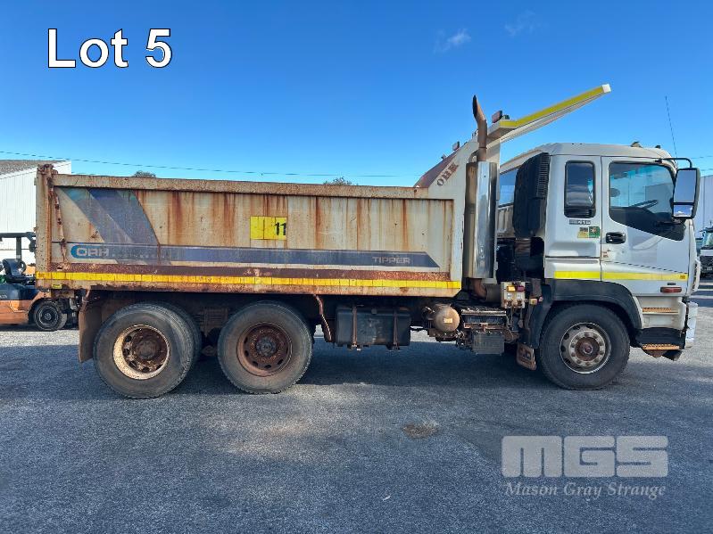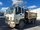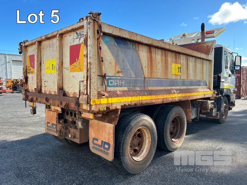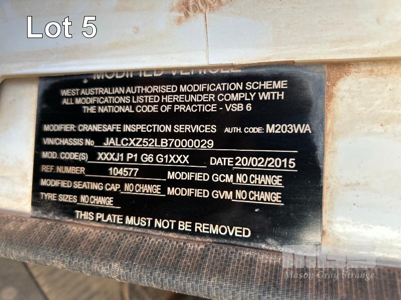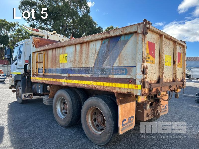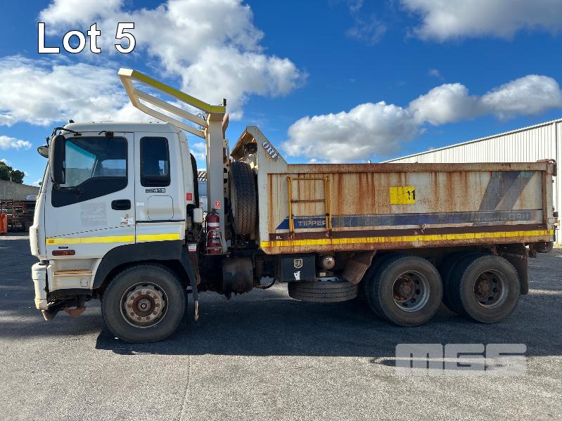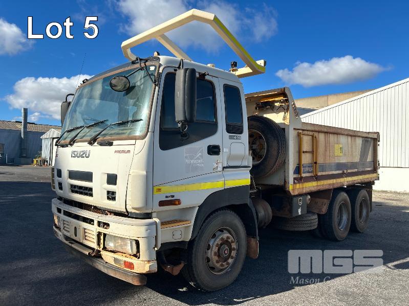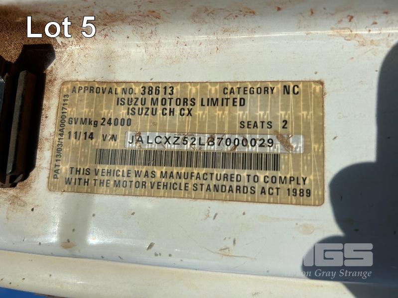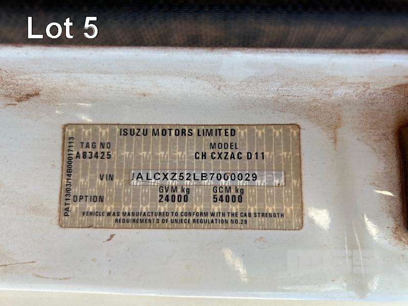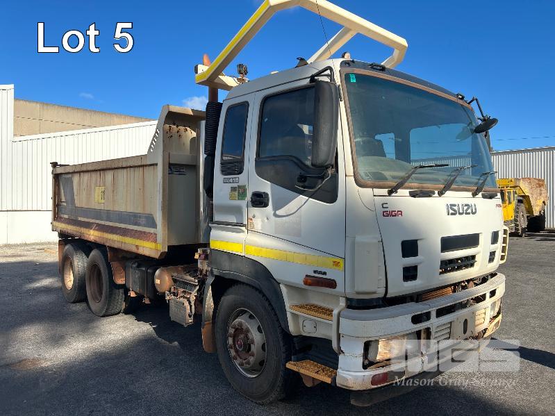 2014 ISUZU CXZ GIGA 6x4 TIPPER REG: NO PLATES VIN: VALCXZ52LB7000029 ENG: 421480 ODO: 141,432kms SHOWING HOURS: 5,369 GVM: 2,400kg GCM: 54,000kg SITEC 415 TURBO DIESEL, AUTOMATIC TRANSMISSION, SPRING SUSPENSION, WHITE DUCO, 295/80R22.5 2 DOORS, 2 SEAT, AIR CON, DAY CAB, HYDRAULICS, RING FEEDER, TIPPER HOIST CONTROLS, FITTED WITH ORN STEEL TIPPER BODY BATTERY ISOLATION SWITCHES FOPS OVER CAB BAR PROTECTION 2 x SPARE WHEELS 2 WAY TAILGATE KEY #40 (WITH 1 KEY/S)