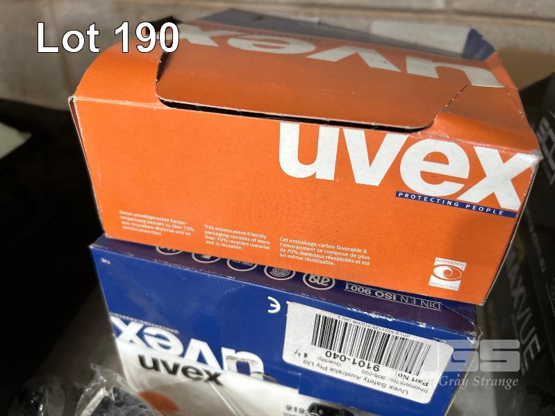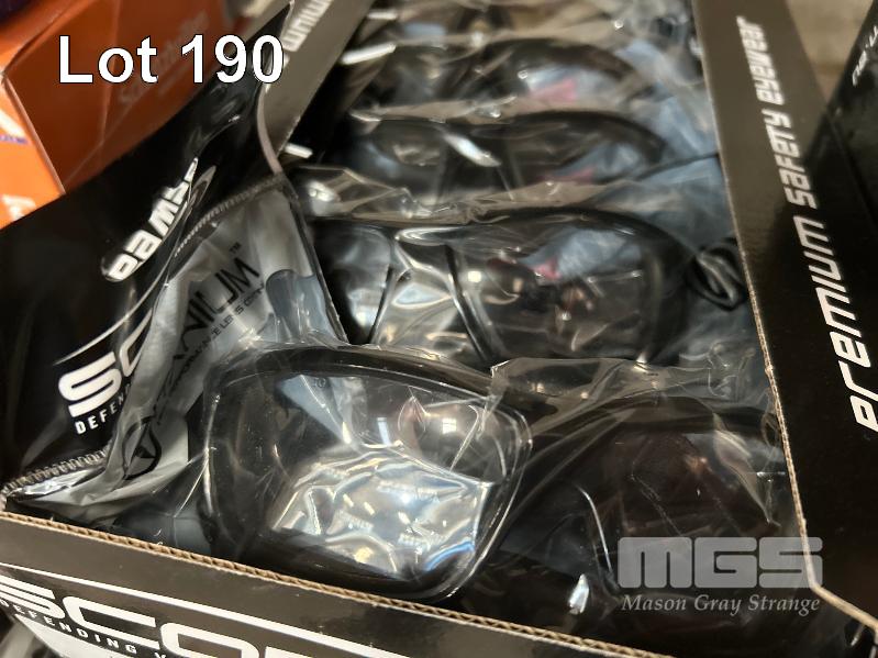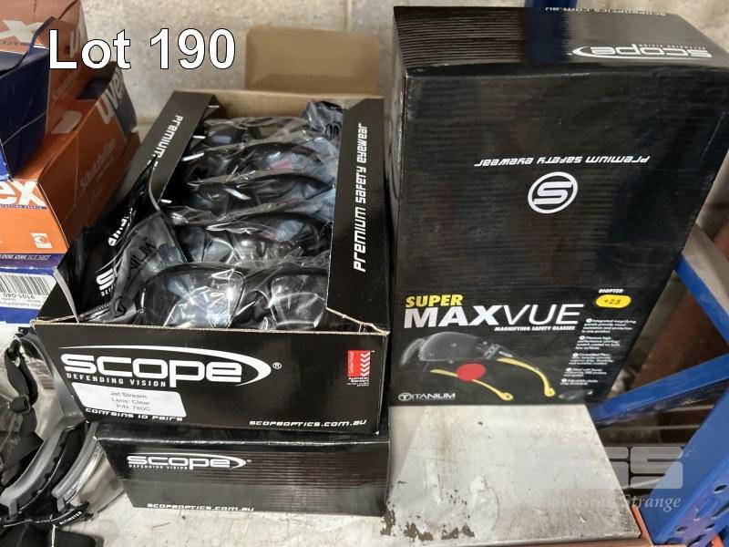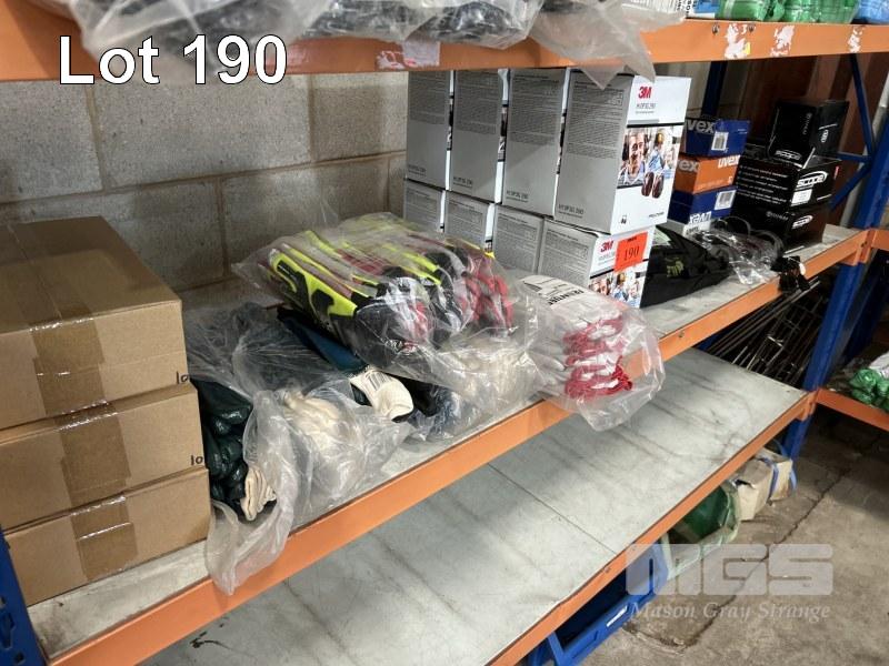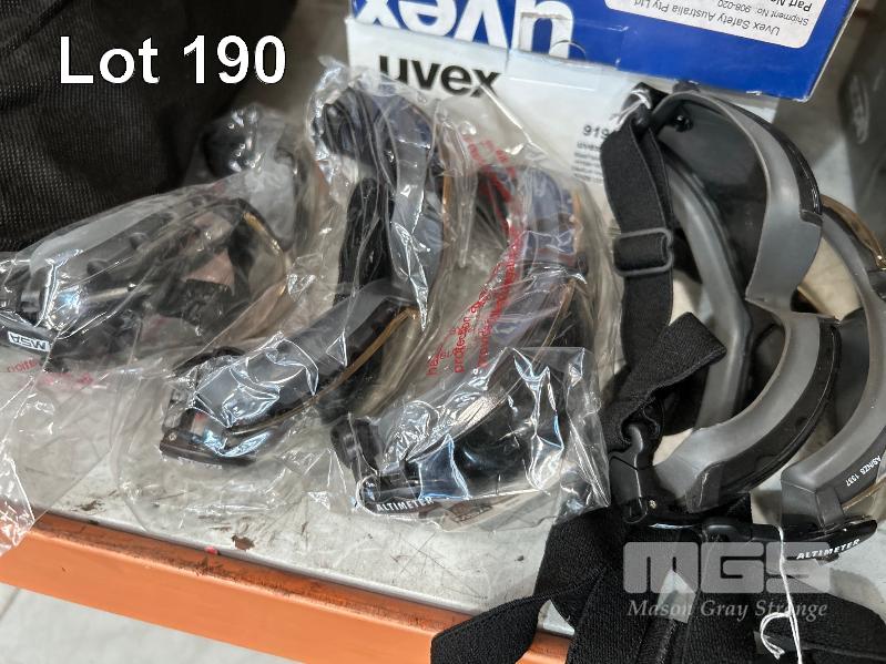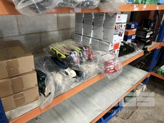 PERSONNEL SAFETY EQUIPMENT INCLUDING GLASSES & GOGGLES, SCOPE, JETSTREAM 3 x BOXES OF 10, UVEX, SPIRIT 4 x BOXES OF 5, 24 x GLOVES, FRONTIER SWAGGY LEATHER, 10 x RINGER HIGH VIS ARMOURED, LARGE, 20 x PRO SUPER LIGHT CHEM RESIST, MEDIUM, 8 x EAR MUFFS, 3M SUIT HARDHAT & MILLERS TIE OFF SLINGS & GLOVE BELT CLIPS AS NEW 1 x SHELF