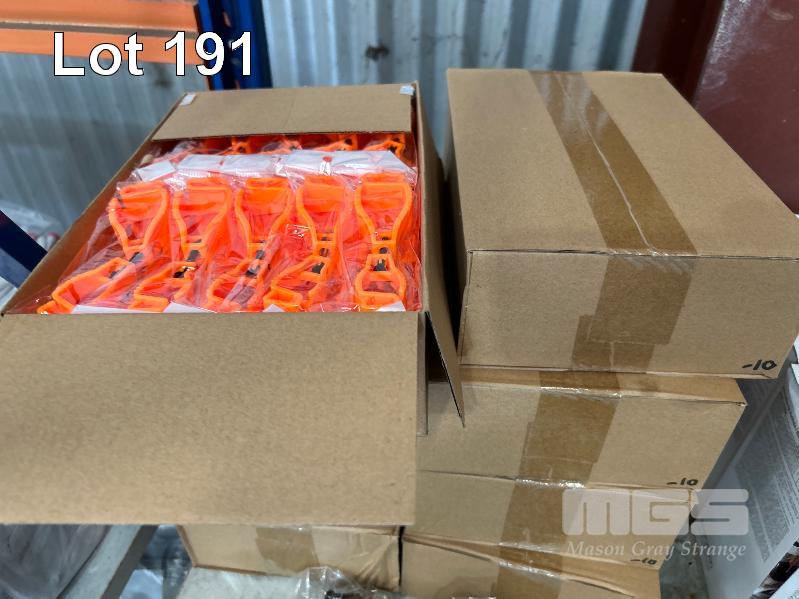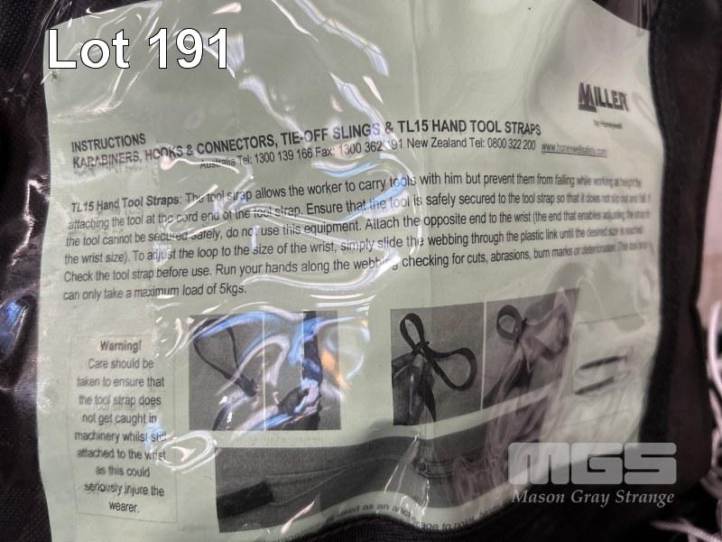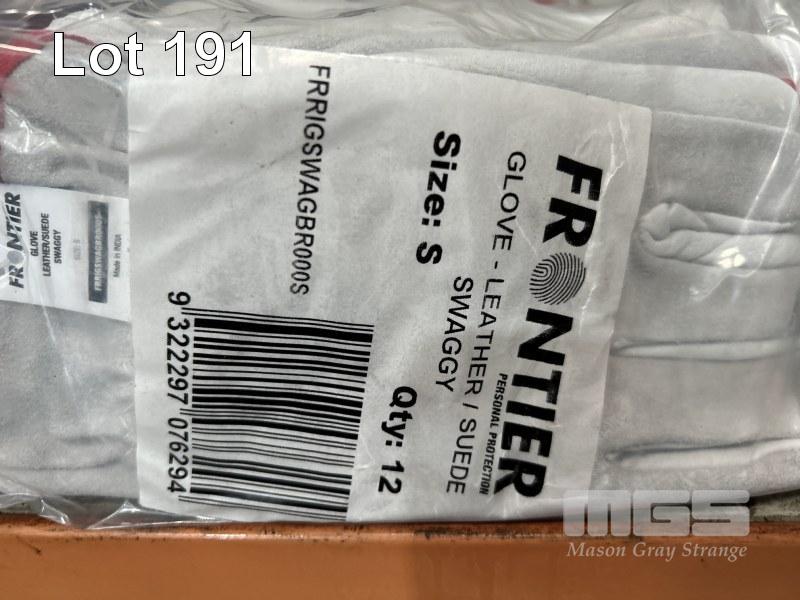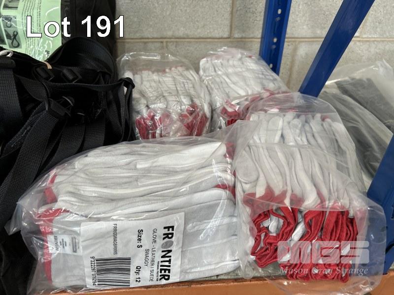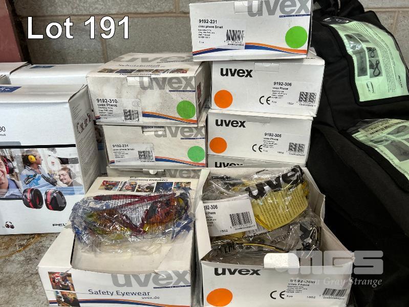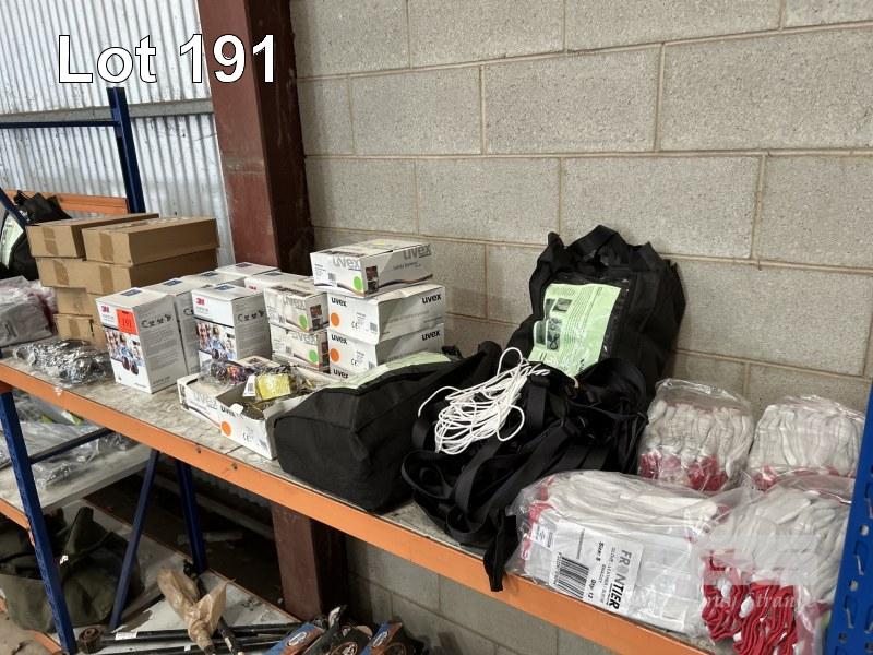 PERSONNEL SAFETY EQUIPMENT INCLUDING SAFETY GLASSES, UVEX, PHEOS, 9 x BOXES, 5/BOX, 48 x FRONTIER SWAGGY LEATHER GLOVES, SMALL, 150 x MILLERS HAND TOOL SLINGS & STRAPS, 6 x EAR MUFFS, 3M SUIT HARD HATS & 8 x BOXES GLOVE BELT CLIPS AS NEW 1 x SHELF