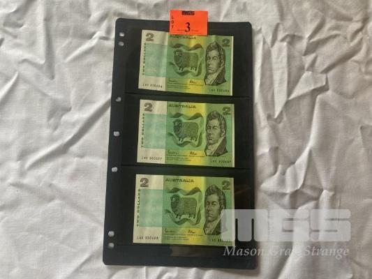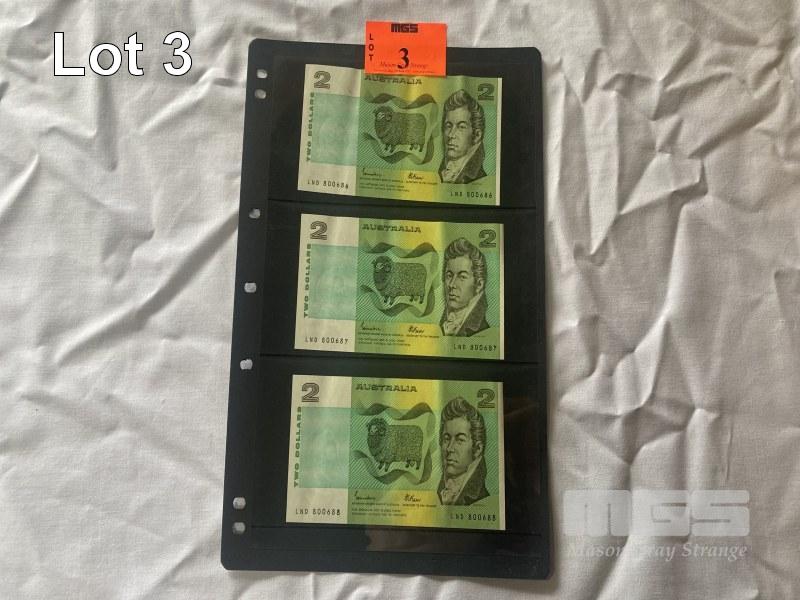 3 X AUSTRALIAN PAPER 2 DOLLAR NOTES, CONSECUTIVE PREFIX LND 800686, 687 & 688, JOHNSON/FRASER