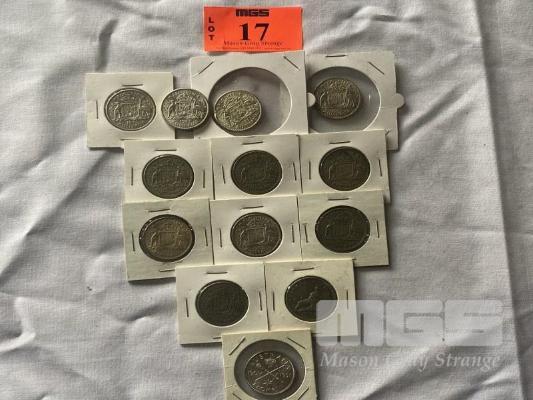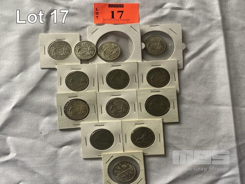 13 X ASSORTED AUSTRALIAN FLORINS INC 1 X 1940, 3 X 1953, 2 X 1954, 1 X 1956, 3 X 1961, 1 X 1962, 1 X 1951 & 1 X 1954 COMMEMORATIVE