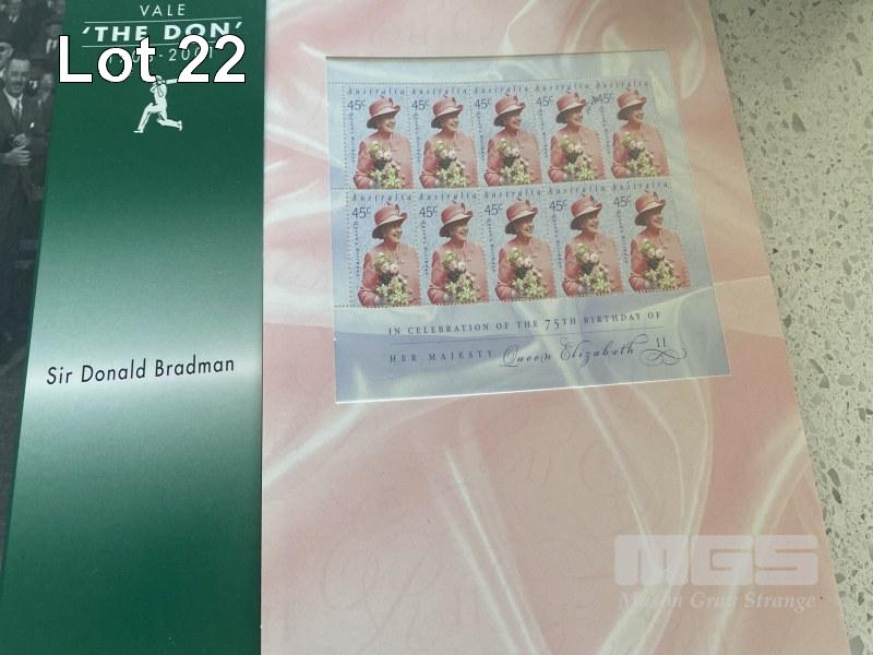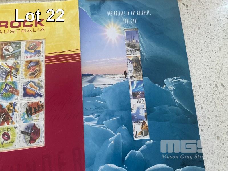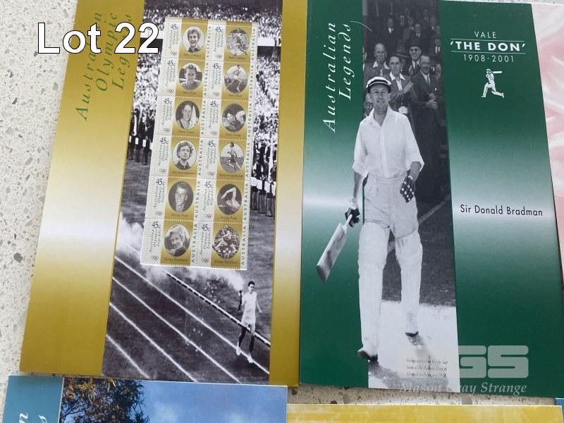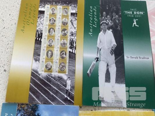 6 X COMMEMORATIVE STAMP SETS INC QUEEN ELIZABETH 75TH BIRTHDAY, AUSTRALIAN OLYMPIC LEGENDS, THE DON, SLIM DUSTY, AUSTRALIANS IN ANTARTIC, ROCK AUSTRALIA