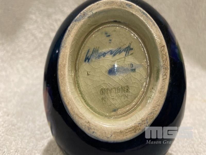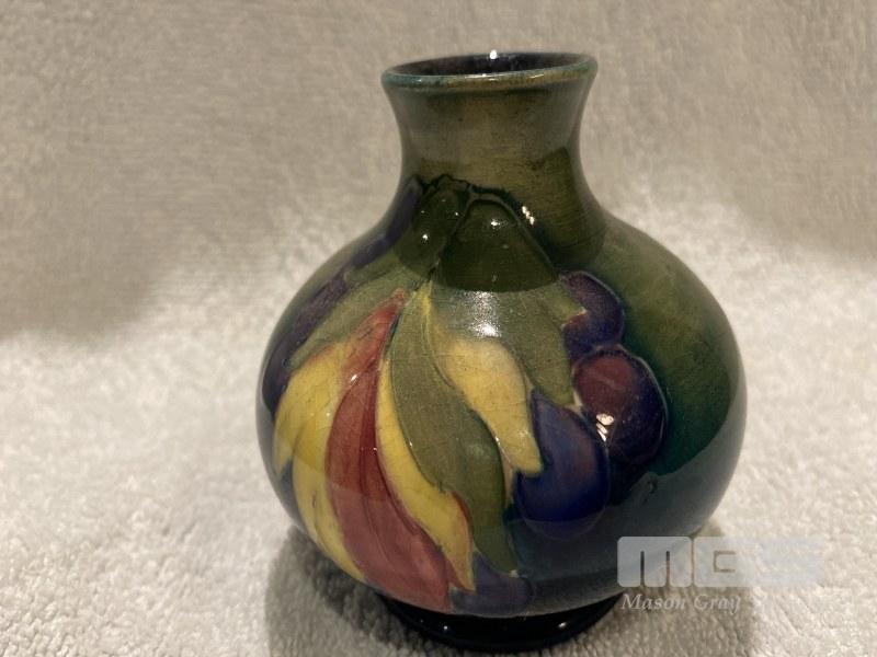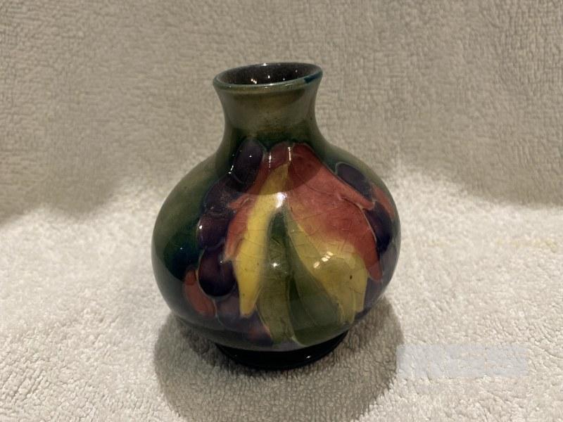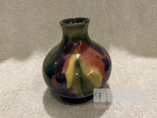 WILLIAM MOORCROFT LEAF & BERRY PATTERNED SQUAT VASE, APPROX 6.5cm H, SIGNATURE TO BASE & STAMPED "MADE IN ENGLAND"