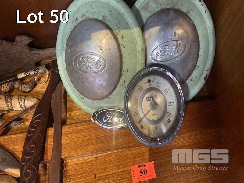 PAIR OF VINTAGE FORD HUB CAPS, SMITHS SPEEDOMETER (MPH) & FORD BADGE