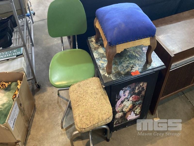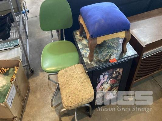 LOWLINE STORAGE CUPBOARD, 2 x STOOLS & CHAIR