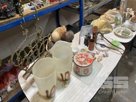 HOMEWARES, 2 x SETS BINOCULARS, SEA SHELLS, PAIR ART GLASS VASES & BRASS MAGAZINE HOLDER