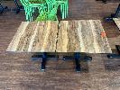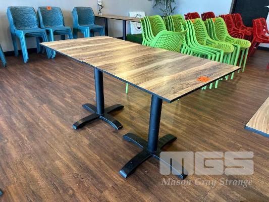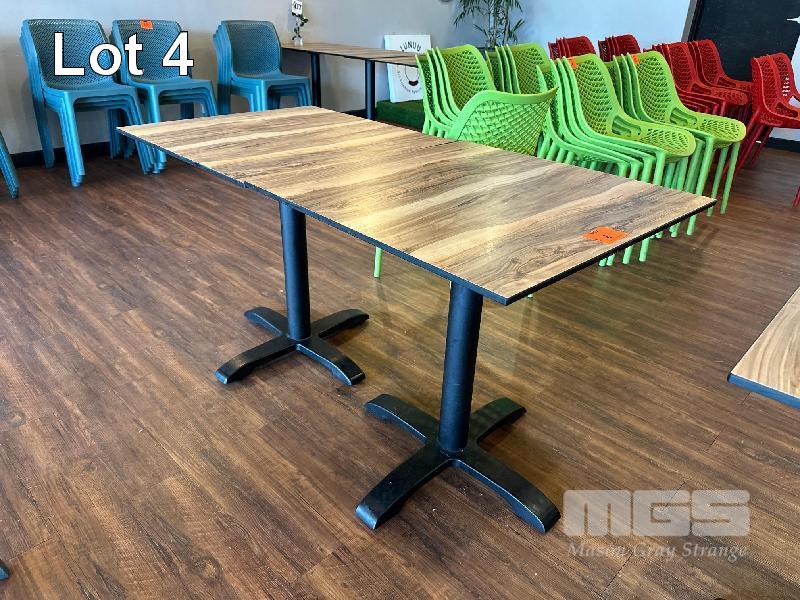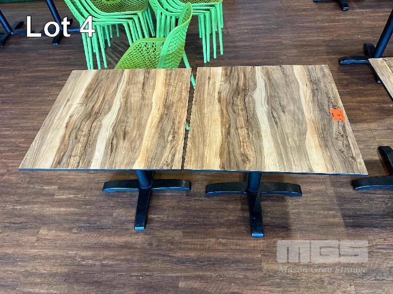 2 x CAFE TABLES, TIMBER LAMINATE TOP, BLACK STEEL PEDESTAL BASE 690 x 690mm