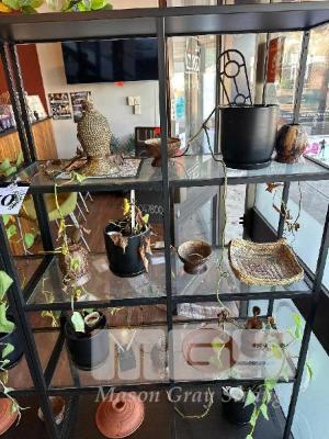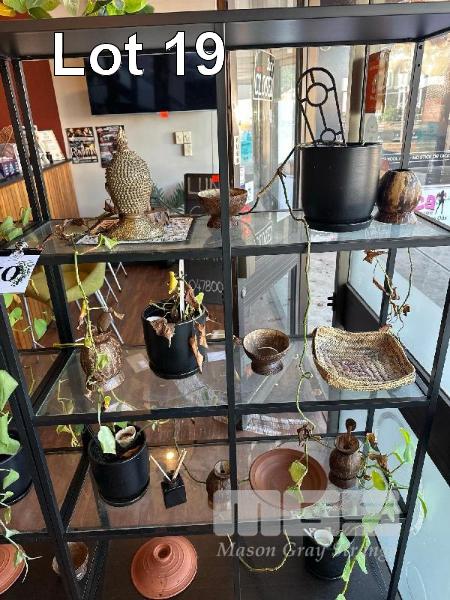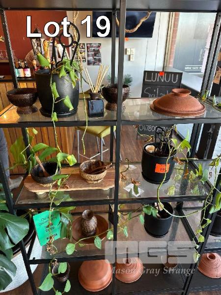 CONTENTS OF 2 SHELF UNITS, POT PLANTS & DECORATIVE PIECES