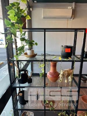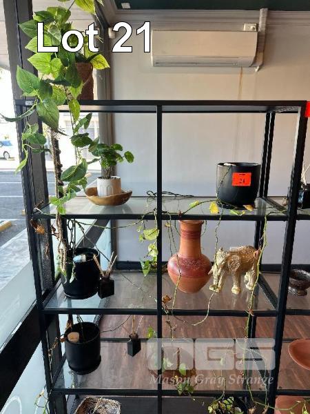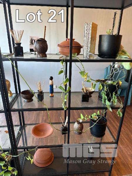 CONTENTS OF 2 SHELF UNITS, POT PLANTS & DECORATIVE PIECES