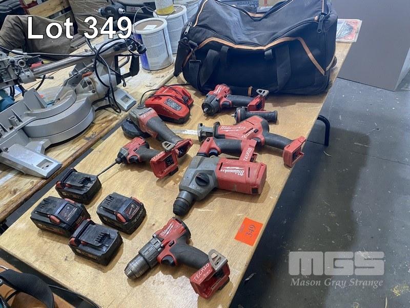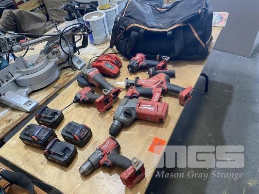 6 x MILWAUKEE CORDLESS TOOLS, 4 x BATTERIES & CHARGER WITH AEG TOOL BAG