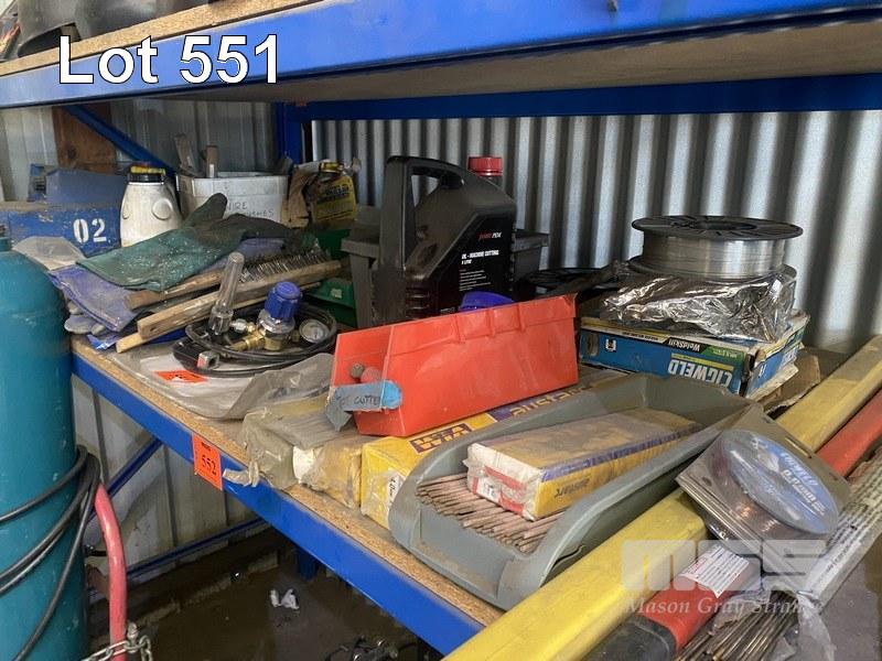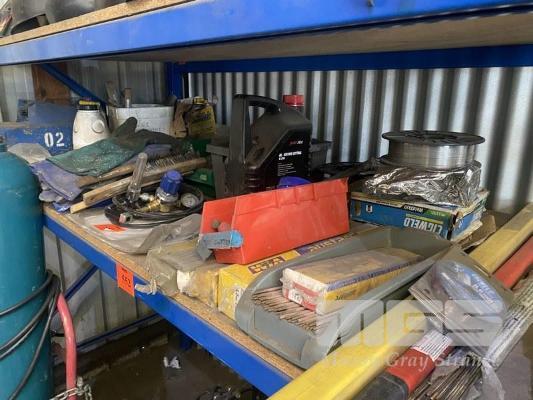 ASSORTED WELDING CONSUMABLES INCLUDING ELECTRODES, WELDING WIRE, GAUGES, ELECTRODE HOT BOX, ETC