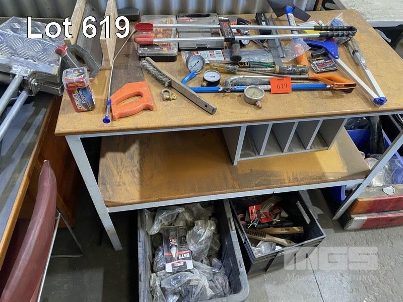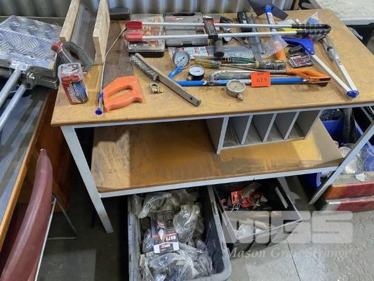 TIMBER BENCH & ASSORTED HAND TOOLS