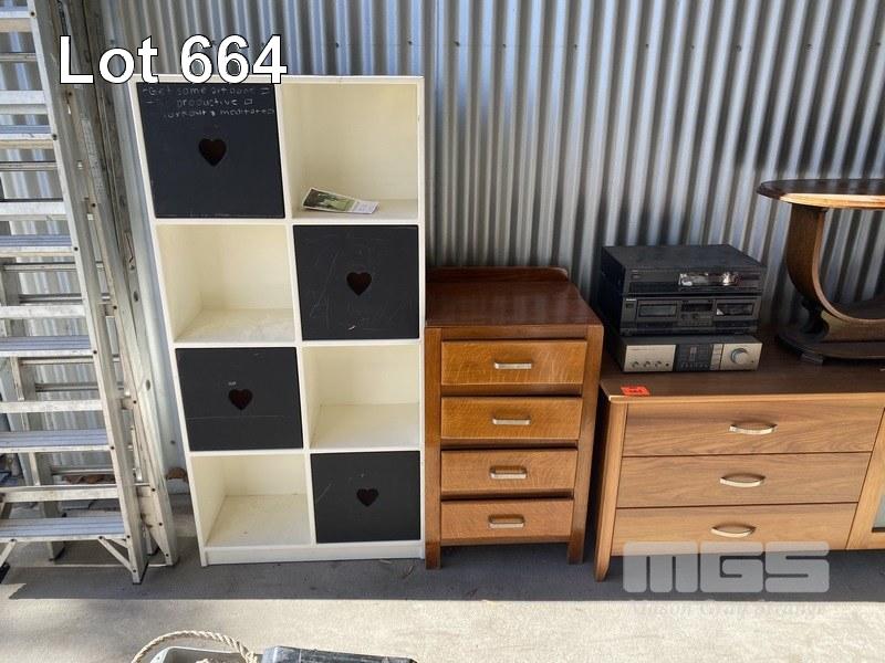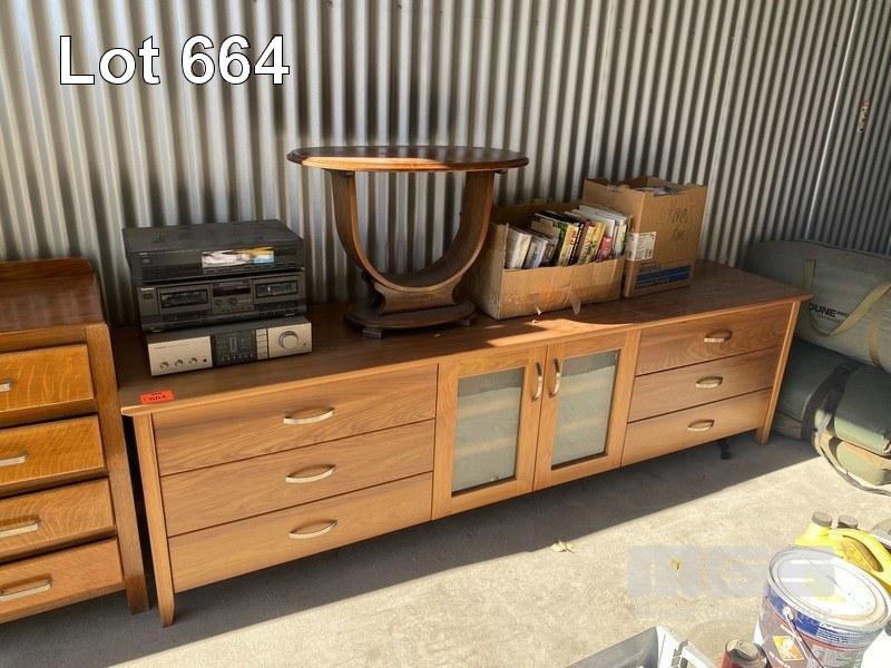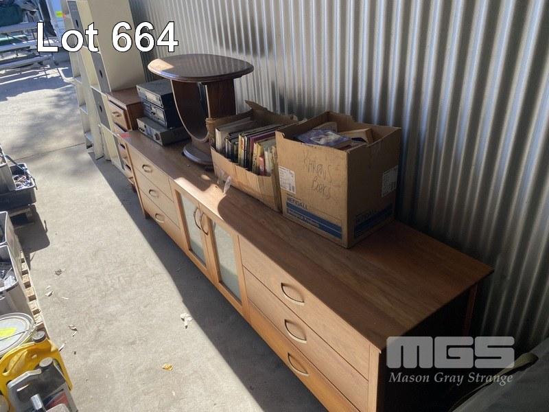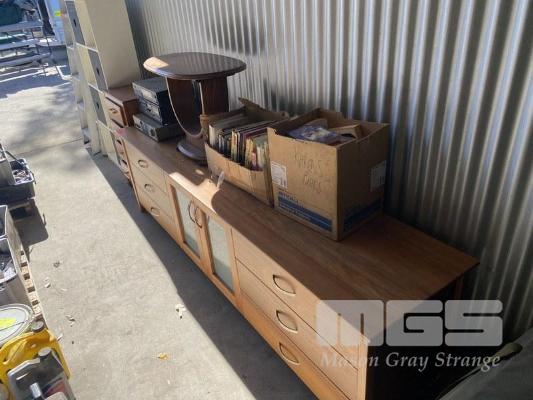 TIMBER SIDEBOARD, CHEST DRAWERS, ART DECO TABLE, BOOKS, MUSIC SYSTEM & BOOKCASE