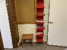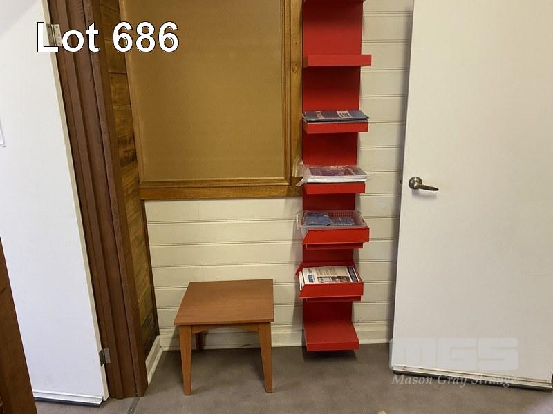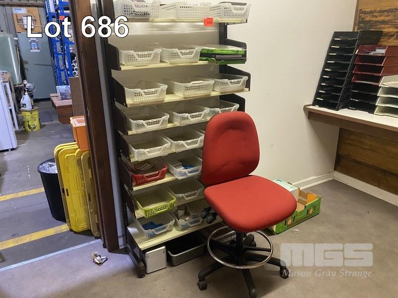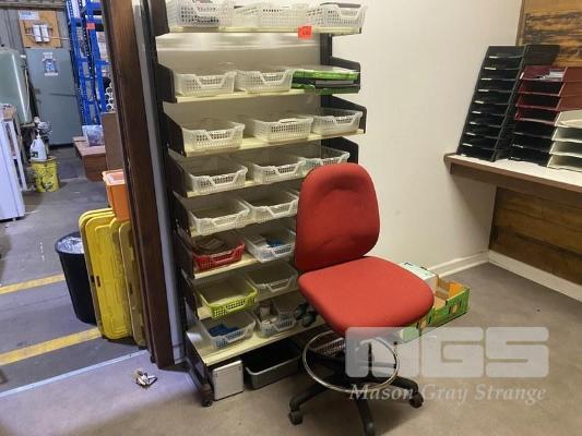 METAL SHELF UNIT, PLASTIC TRAYS, OFFICE CHAIR & OCCASIONAL TABLE