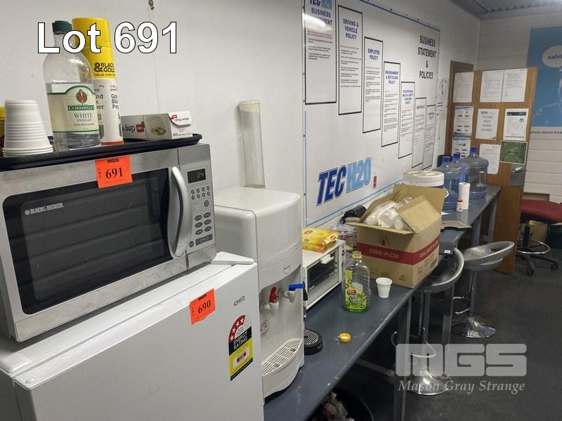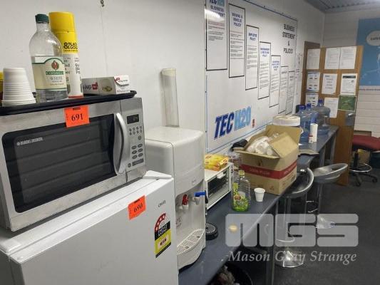 BLACK & DECKER MICROWAVE, WATER COOLER, DELONGHI COFFEE MACHINE, RONSON COMBI OVEN & 2 x BAR STOOLS