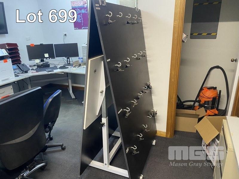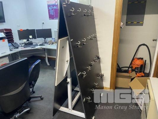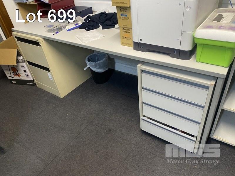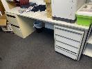 DESK, GREY LAMINATE, DOUBLE SIDED NOTICE BOARD, 2 DRAWER FILING CABINET, PEDESTAL & SHELF