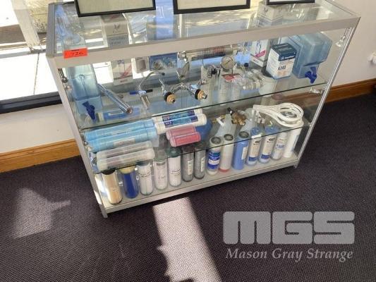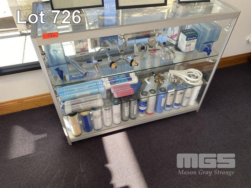 GLASS DISPLAY CASE, 1200 x 900 x 450mm & CONTENTS FILTERS & PLUMBING FITTINGS