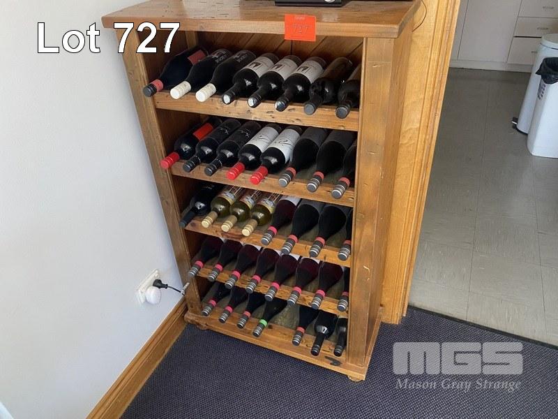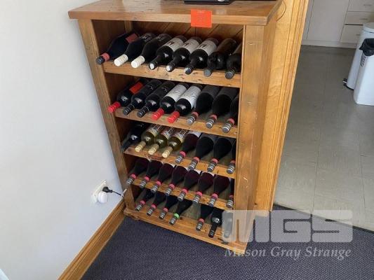 STAINED TIMBER WINE RACK & 34 x BOTTLE WINE