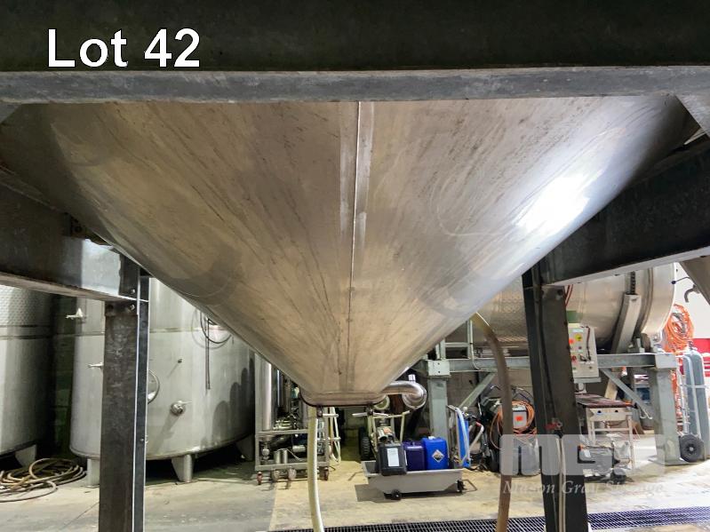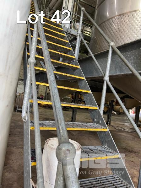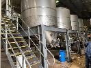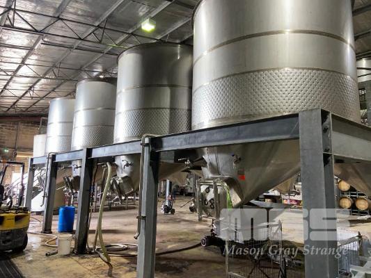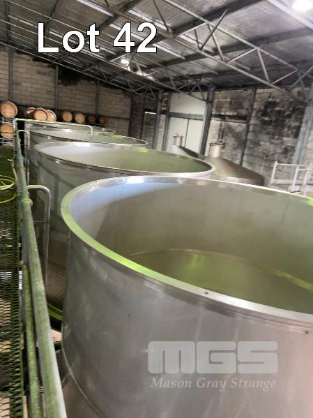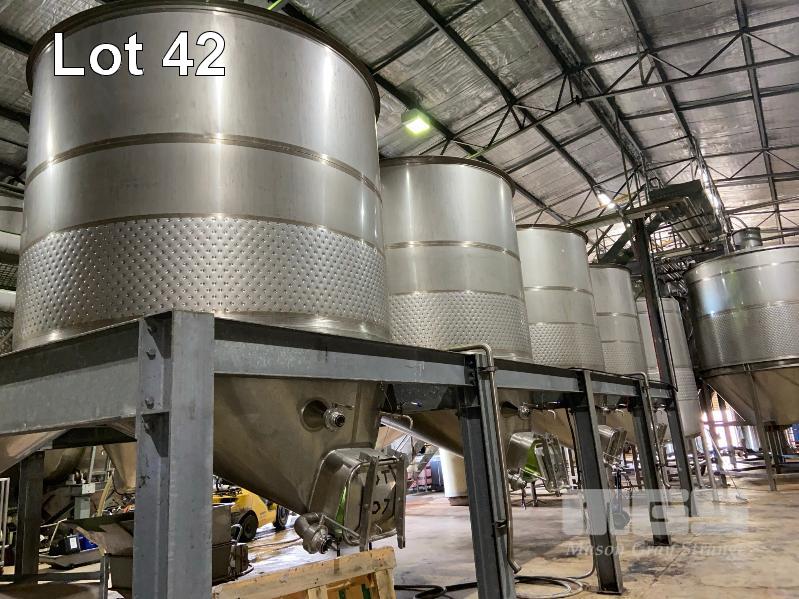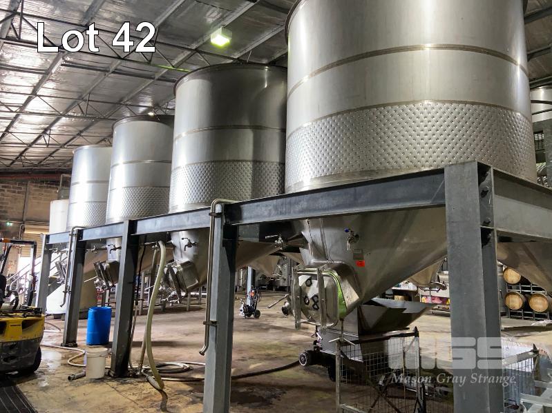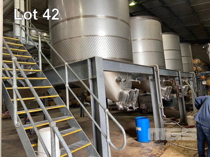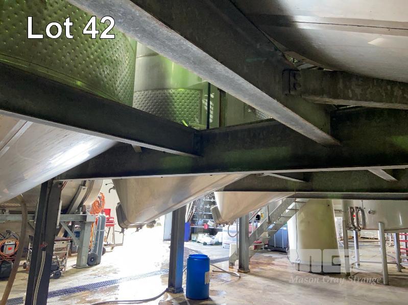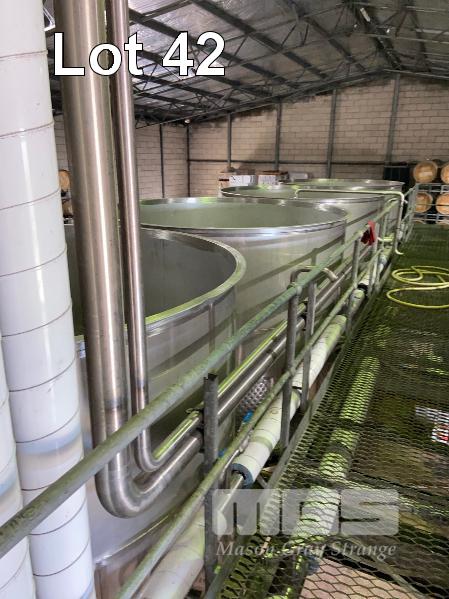FERMENTATION TANK FARM, (FIXED) 8 x JMA ENGINEERING OPEN TOP FERMENTATION TANKS 316 STAINLESS STEEL DOM: 2010 EACH 10 TONNE CAPACITY DIMPLE PLATE COOLING (BRINE) SIDE HATCH, TAP, 50 - 75mm VALVES 2650mm DIAMETER TANKS MOUNTED ON I-BEAM GALV FRAME 200UC x 400UB 11.7 x 6.9 x 4.5m (H), STAIRCASE & CAT WALK LEVEL 1