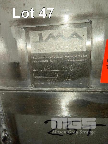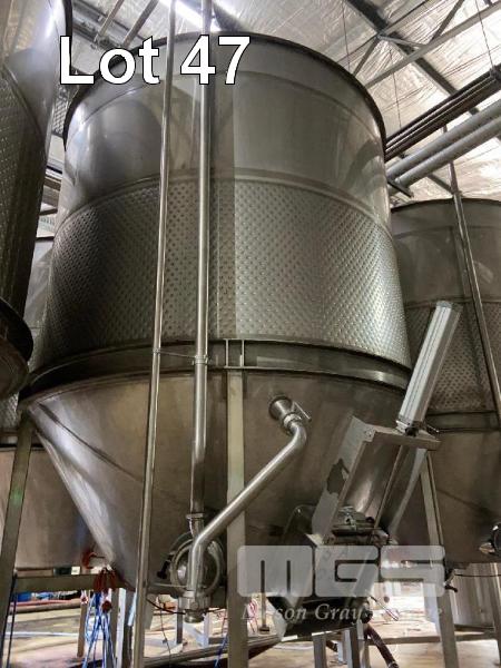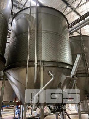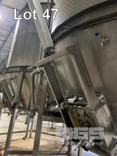 FERMENTATION TANK, SWEEP ARM, FREE STANDING JMA ENGINEERING CENTRE AGITATOR 316 STAINLESS STEEL DOM: 2010 EACH 25 TONNE CAPACITY AIR GATE SIDE HATCHES, 75 & 50mm VALVE EACH WITH STAINLESS STEEL CENTRIFUGAL MIXING PUMP, 415V DIMENSIONS: 6.4 (H) x 3.3m DIAMETER APPROX